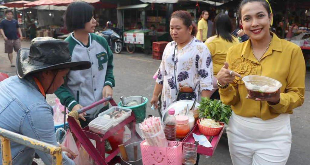 วันนี้ (2 มี.ค.63) ที่บริเวณตลาดสดเทศบาล 2 ตำบลตลาดหลวง อำเภอเมืองอ่างทอง พบแม่ค้าก๋วยเตี๋ยวไอเดียแจ่ม ใช้รถเข็นขายก๋วยเตี๋ยวหมูน้ำตก เป็นรถเข็นขนาดเล็ก (มินิ) สีชมพู ขนาดกว้างยาวประมาณ 90 เชนติเมตร และมีล้อ 4 ล้อเพื่อใช้เข็น ตรงกลางวางเตาถ่าน มีหม้อก๋วยเตี๋ยวขนาดเล็ก มีการจัดวางเส้นก๋วยเตี๋ยว ผัก เนื้อหมู ลูกชิ้น พร้อมเครื่องปรุงก๋วยเตี๋ยวไว้ในรถเข็น สามารถลากบริการลูกค้าไปทั่วตลาด ขายให้กับบรรดาแม่ค้า และลูกค้าที่มาจับจ่ายซื้อของภายในตลาด เป็นทั้งการสร้างจุดขาย และสร้างความสะดวกสบายให้แก่ลูกค้า ด้วยการบริการแบบเข้าถึงที่